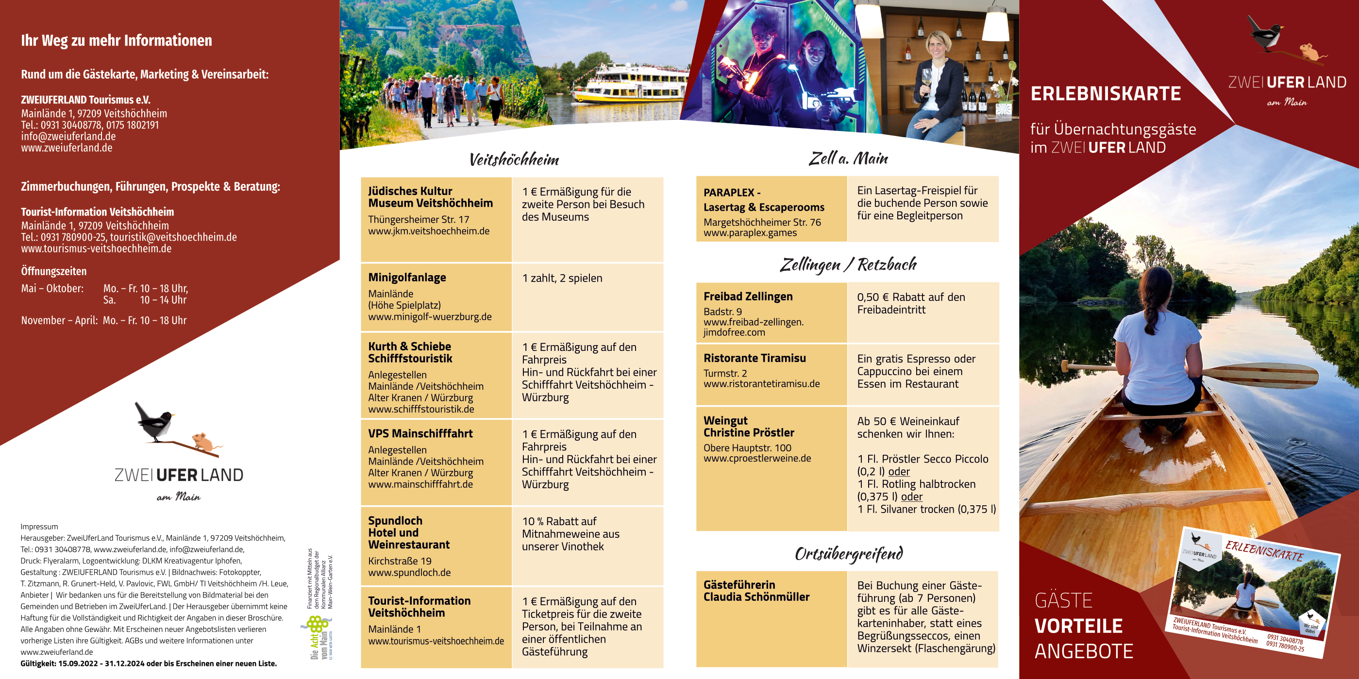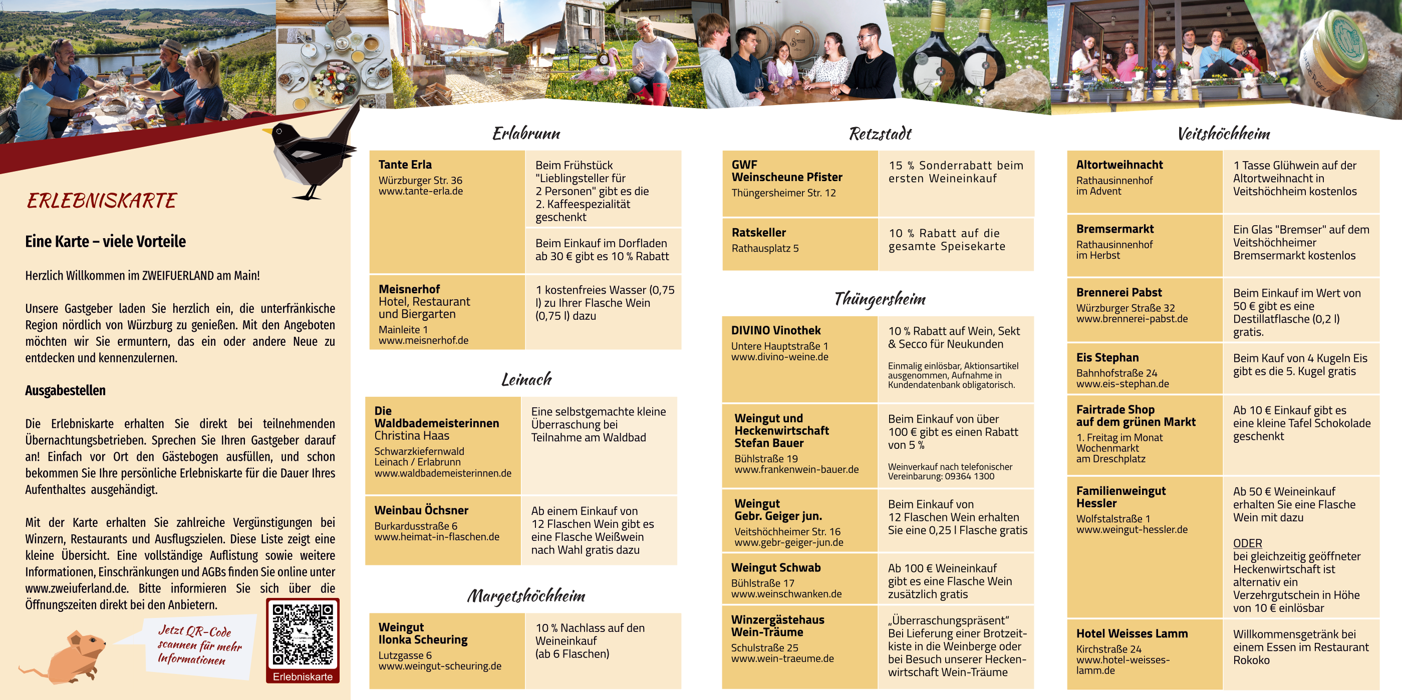 Mit unserer Gästekarte erleben Sie viele Freizeitaktivitäten und Angebote in Zell a. Main, Margetshöchheim, Erlabrunn, Leinach, Zellingen, Retzbach, Retzstadt, Thüngersheim und Veitshöchheim zu ermäßigten Preisen oder es gibt ein kleines Geschenk zu Ihrem Einkauf dazu.